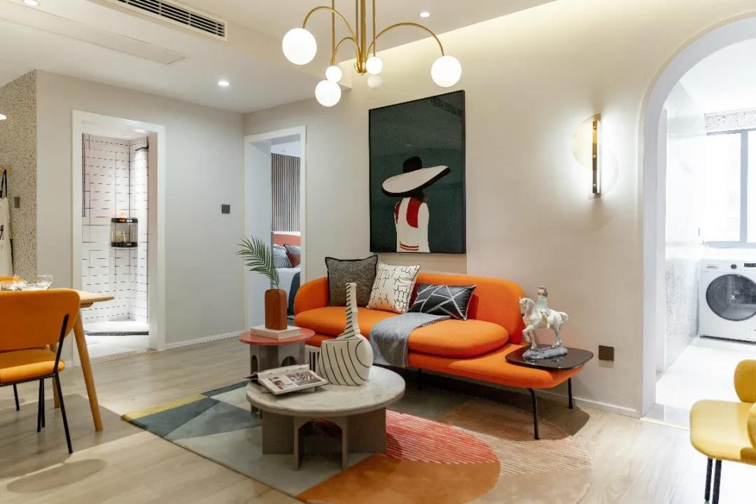 在这套56平米的小公寓中,整体空间以现代风的空间,布置金属质感与鲜艳的软装,让空间透露出一种轻奢***的气质,在大面积橙色的运用下,细节装饰画加入女性背影的优雅画面,使得空间充满华丽***的档次与气质。