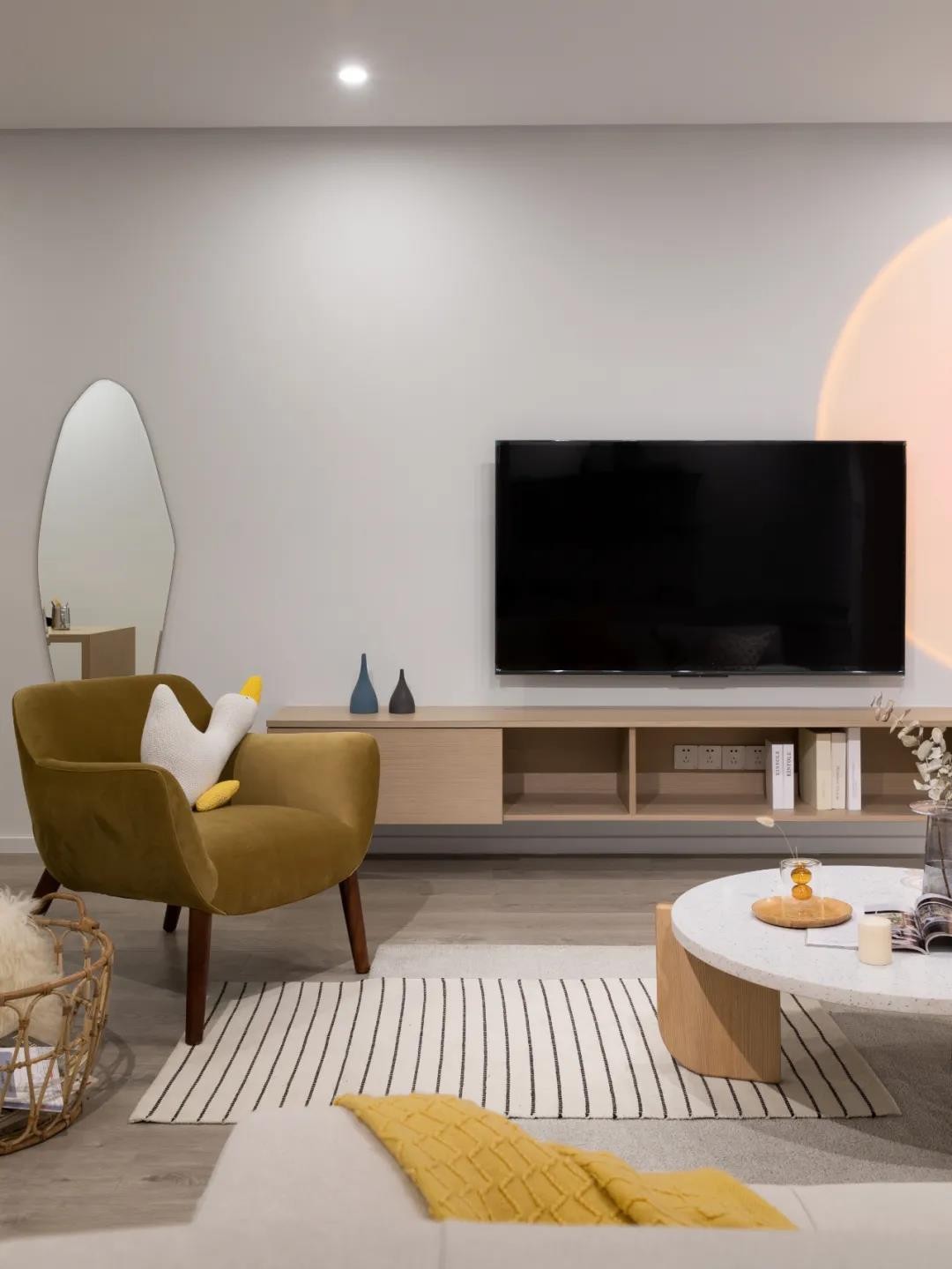 奶白色多人沙发+姜黄单人沙发,搭配浅棕色羊毛地毯,带来超舒适的包裹感。