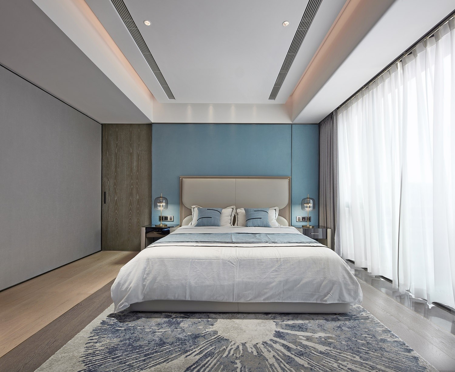 蓝色是静谧,灰色是沉稳。 夜晚,在海浪中入睡,有灯塔的指引,在梦里触摸到月光的柔软。 轻奢感床品,一夜好梦,非常轻松。 白日,坐在床尾的小角落里,拉开窗帘, 在这里喝茶看书,欣赏美景。