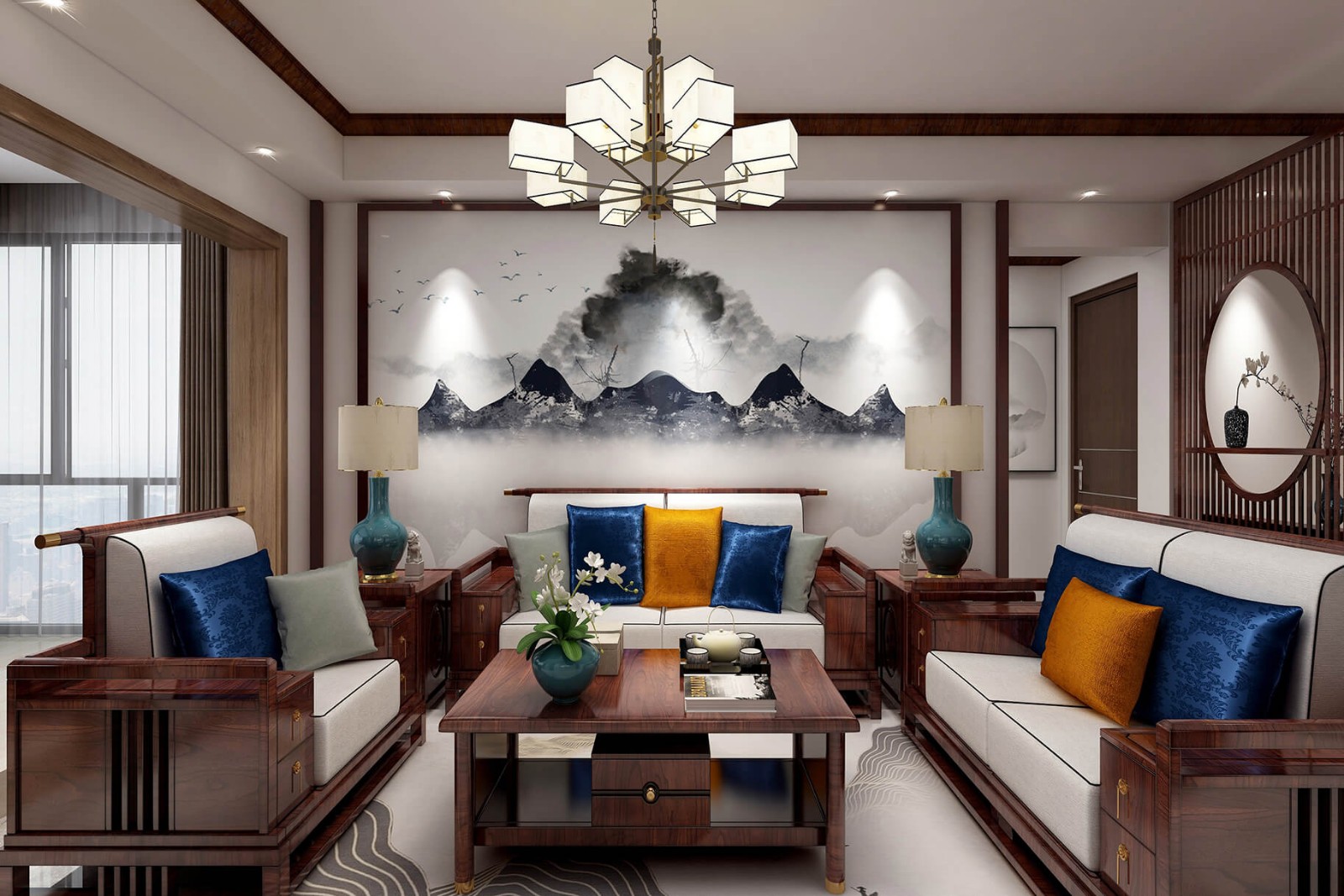 富有中式特色的客厅,饰以精巧的灯具和山水画的背景墙,使整个居室在浓浓古韵中渗透了几许现代气息。
