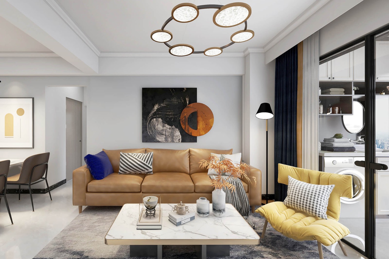 客厅整体以白色为主,再以暖色系的沙发作为点缀,给人温馨感十足,为业主提供一个很好的休憩空间。