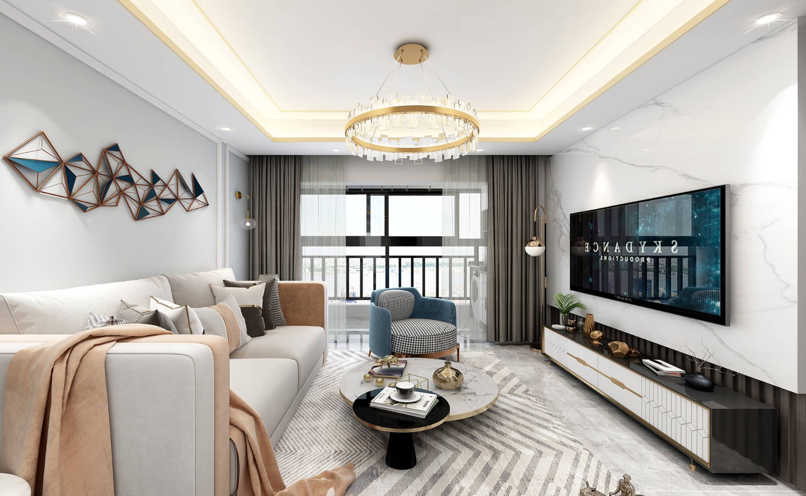 客厅整体以浅灰色为主,客厅中间使用了金属环形吊灯,使得空间轻奢又有档次。