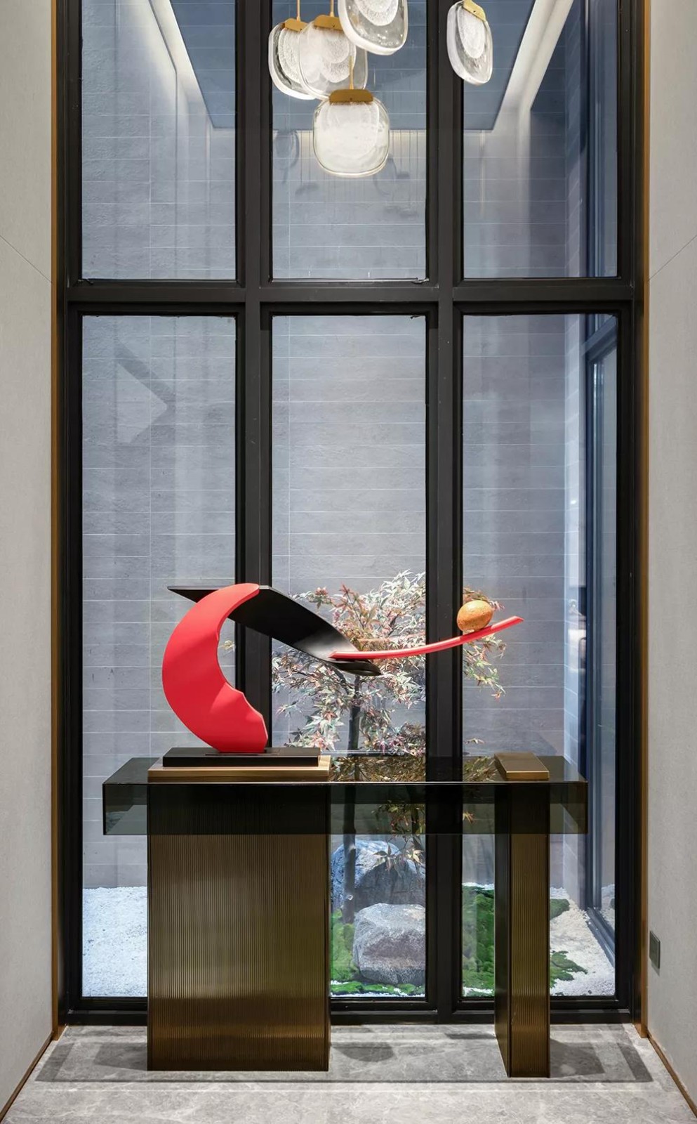 水利万物而不争,玄关承担着室内外的转换,宜藏风聚气。设计师在这里设置了流水型艺术雕塑,优雅的弧度和曲线之间,轻松优雅的气息弥漫,让人在进入家门的瞬间感受杨柳般的微风拂面,放松身心。