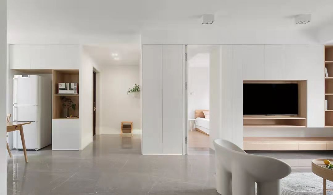 电视墙设计了一整面墙的柜体,满足收纳需求的同时,形成整洁利落的视觉感。