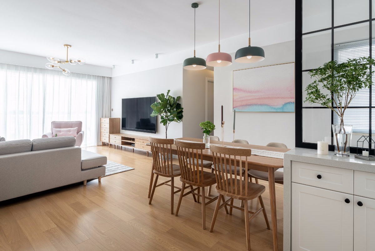 客餐厅在设计上尽可能不吊顶,所以在照明上运用明装射灯,增加灯光氛围。橡木原木地板,橡木家具,暖灰色墙面与布艺,点缀粉色主调的挂画灯具与单人沙发,营造出温馨又舒适的北欧色调。