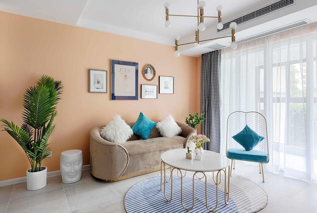电视背景墙布置的很简单,永恒白与橘粉色的拼接设计,简约时尚的电视柜又与玄关柜相呼应