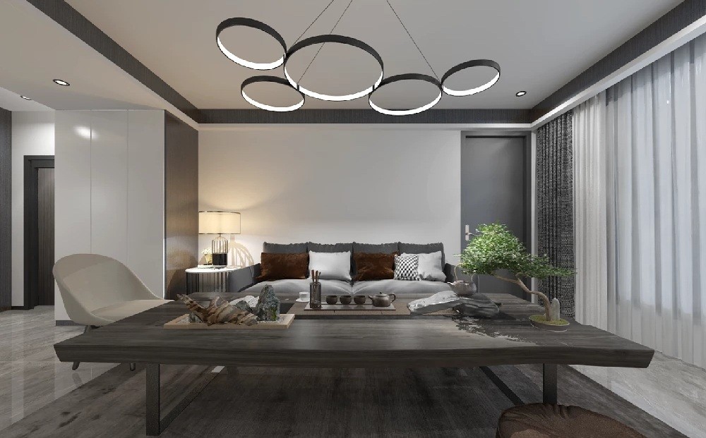 大量运用高纯色彩,大胆灵活,遵循现代风格家居的同时彰显个性。灰色系的运用,使整个空间显得典雅别致,茶几上摆放的茶具以及盆栽,有一种禅境。