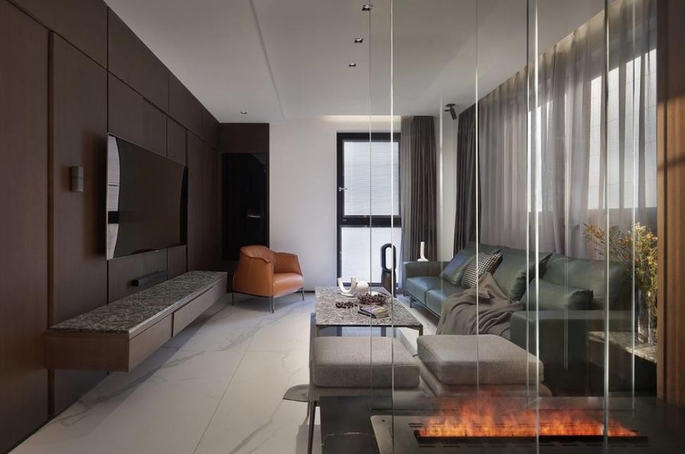 入户与客厅之间采用清玻作为隔断,其中可见炉火,亦可见厅内模样