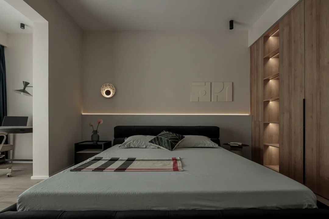 卧室雾灰可灵动可厚重,背景墙隐形灯带与墙面壁灯加强层次感