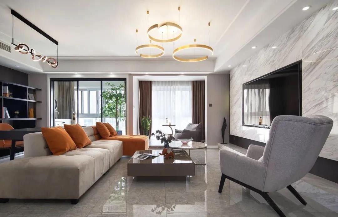 餐厅,简约浅薄的餐桌搭配现代简约的餐椅,黑灰色的基调中搭配橘色餐椅与玫瑰金的轻奢吊灯