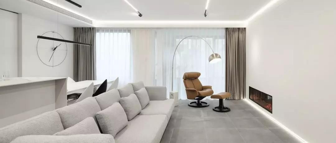 客厅依然走极简路线, 里面采光充足、配色大气, 再加上嵌入式灯带的巧妙衬托, 让整体显得时尚又高雅。
