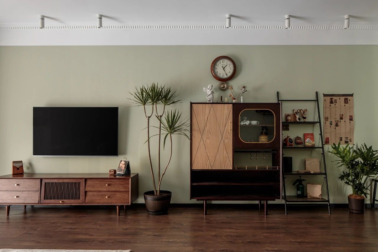 ▲ 客餐厅背景墙连为一体 电视背景区别于常规客厅的摆放形式,复古家具、植物错落排布,不同纹理质感的木头混搭,灵动不呆板。悠然、质朴的气质让家更有归属感,并承接空间里多元化风格的重组。