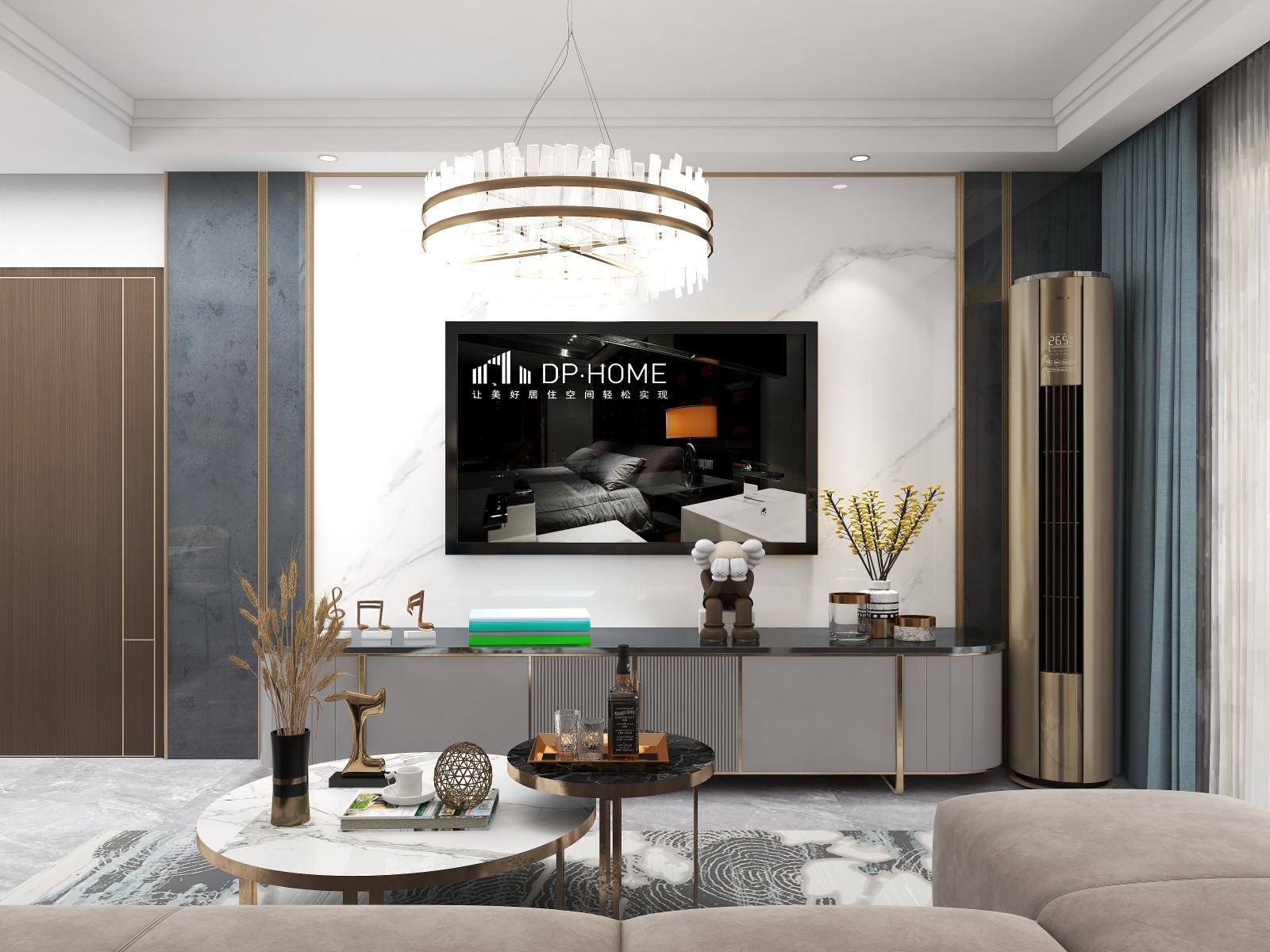 整体的色调是灰色,其中蓝色的窗帘盒白色的电视背景墙是重要的点缀色,金色的空调和金色扣条是跳跃色。