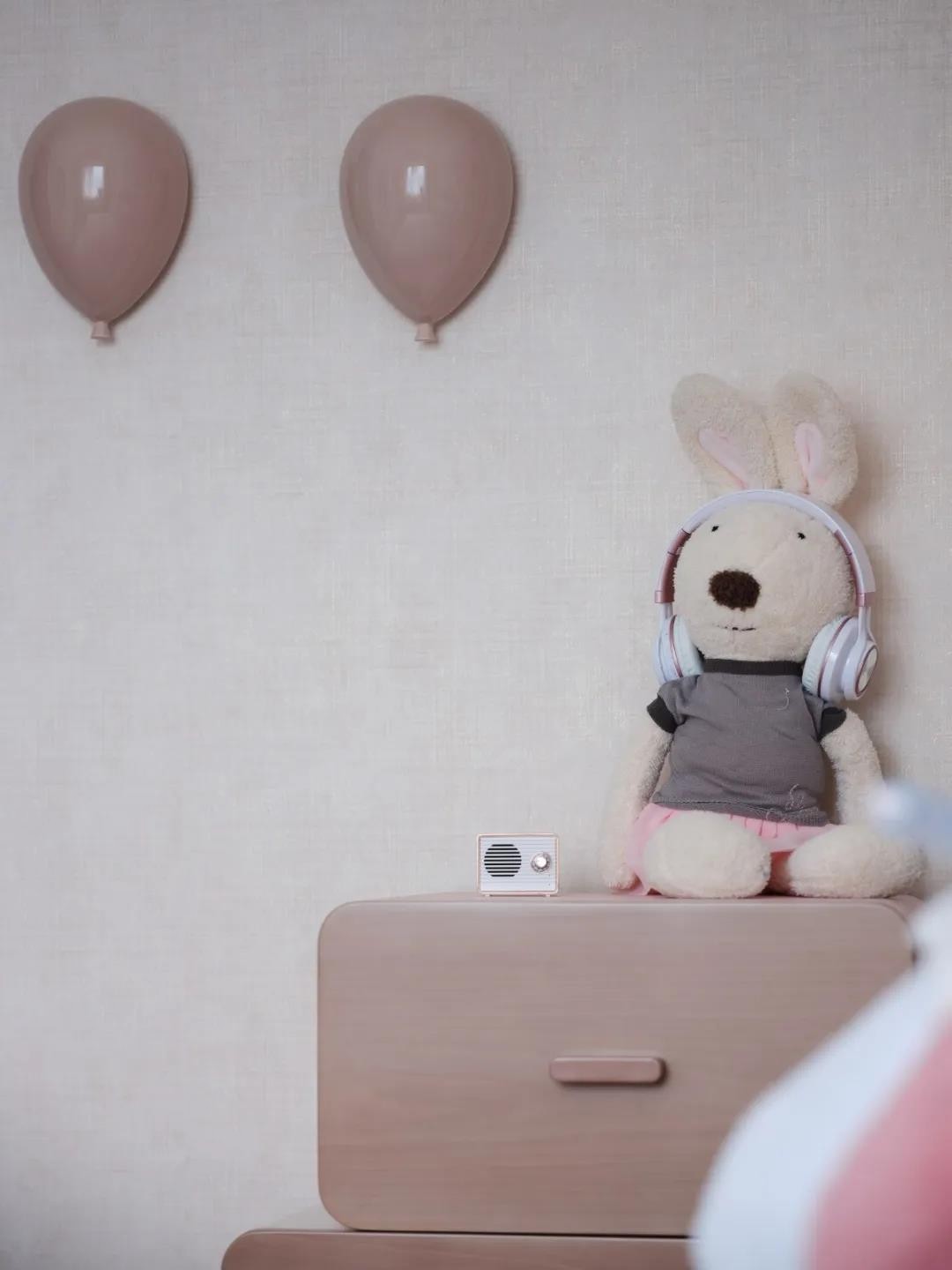 床尾柜上的公仔布置,墙面两个气球造型的壁灯,也增添了空间的童趣与活泼气息