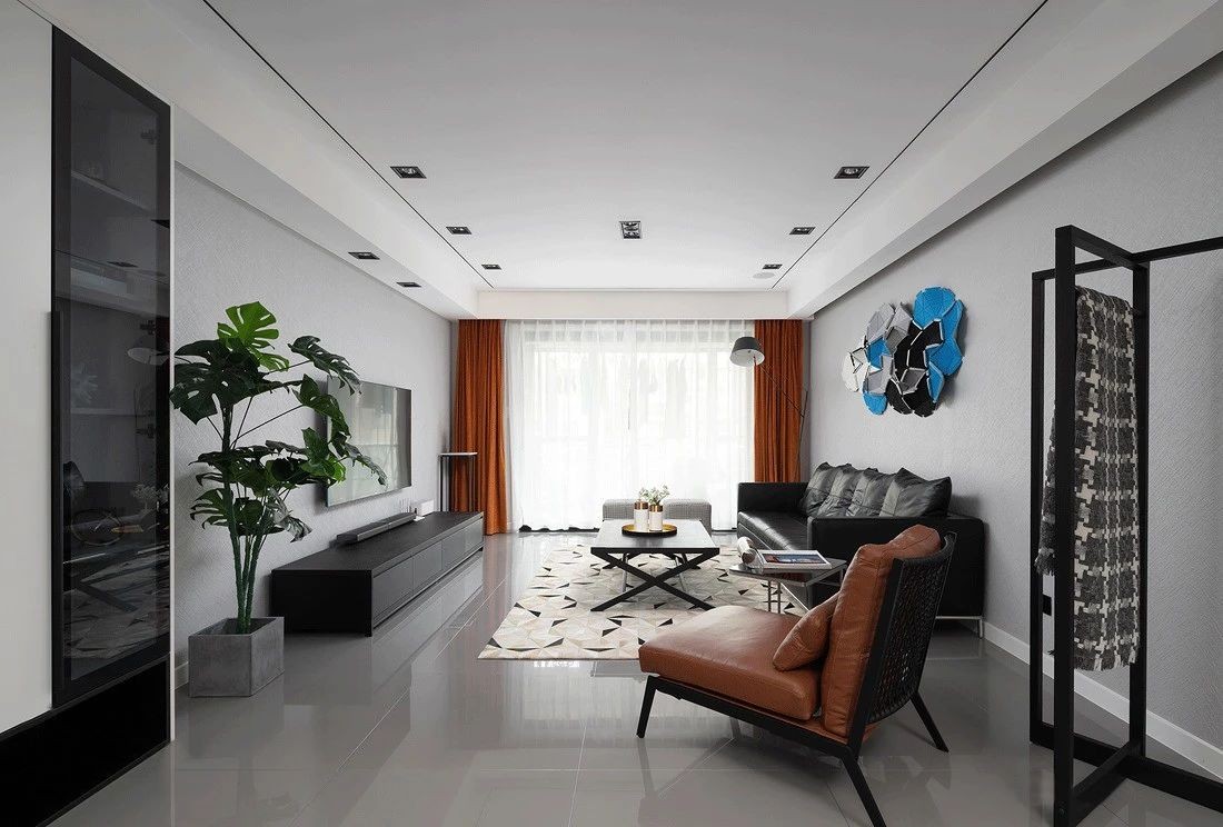 设计师以黑白灰为主色调,焦糖色单人沙发与橙色窗帘点亮空间。黑色皮质沙发质感满满,与黑色茶几一起稳住空间气场。背景墙上黑白灰与蓝配色的墙饰别具一格,时尚而又独特。