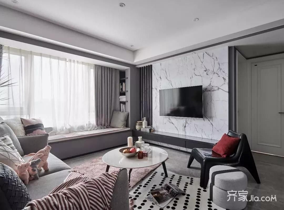 客厅电视墙整体以大理石纹理的背景,地台+壁挂电视机,整体简洁优雅而大气。