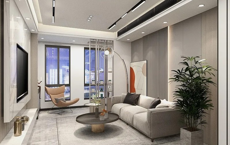 客厅采用偏白色为主色调,点缀局部的橙色和灰黑装饰,让空间跳脱不沉闷。