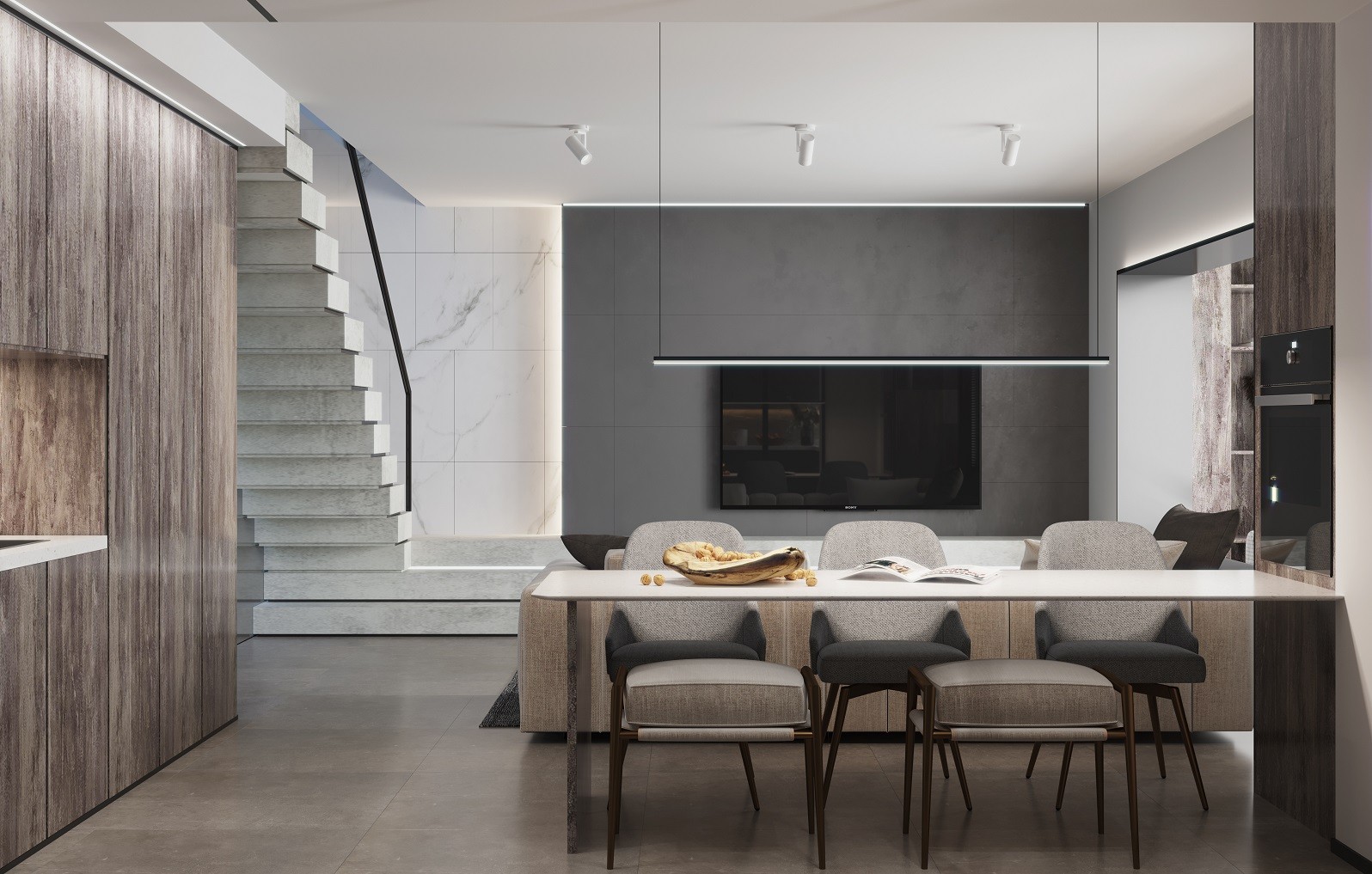 以浅灰色为主调,整体干净简洁,没有多余的装饰物品。设计中我更想表达的是让内饰与自然结合,凌乱的木纹又显得整洁错落'而大方。半开放式的布局,气氛利落贯通,视线一览无遗。