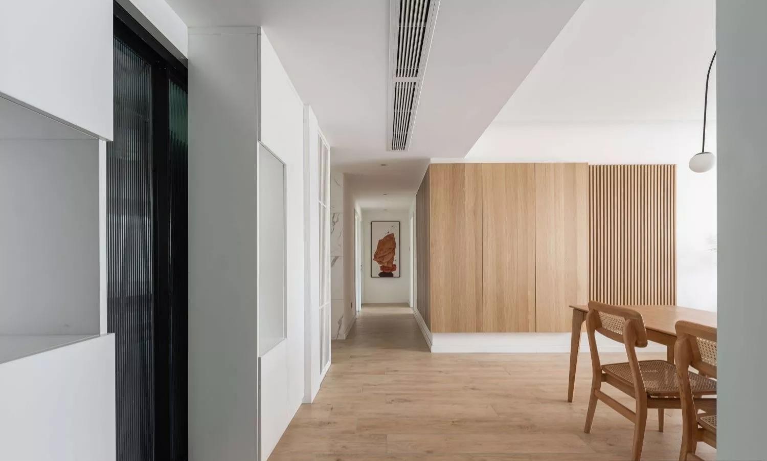 入户左手为玄关换鞋区,一镜到底的空间通透感,让空间倍感舒爽与透亮。
