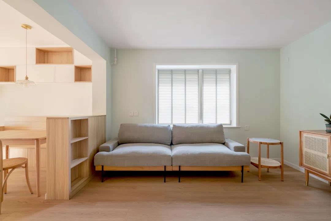 原木色地板搭配马卡龙色墙面,营造出清新自然客厅氛围。浅灰色的沙发不仅有颜值,坐感也很舒适。