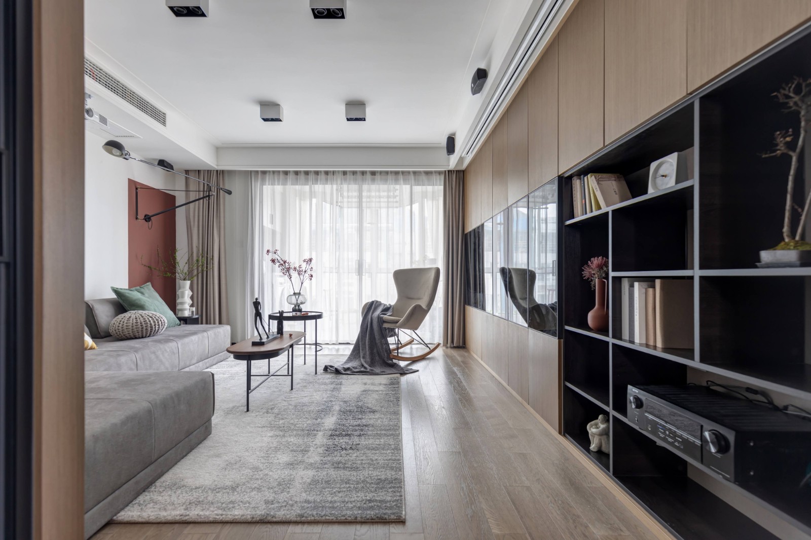 屋主一直有读书的习惯,希望能营造家庭读书的氛围,而客厅是整个家最核心的区域,读书、藏书的功能在这个区域可以发挥的淋漓尽致。投影幕布代替电视机,释放柜体空间,整排书柜既实现了书籍的放置,也解决了收纳的问题。书柜的木质柜门仿照KD板的颜色和木纹做油漆门,反复调色确认,尽可能缩***差,统一木色。沙发背景在白色调的基础上,增加一抹绯红,与莫奈的《日出·印象》色彩相呼应。正如莫奈所说:很多人认为一定要去理