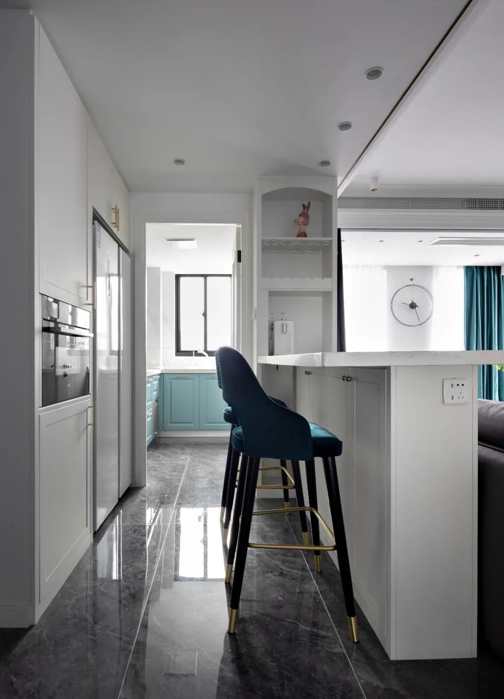 吧台后边便是通向厨房的过道,急需收纳的小宅,设计师当然不会放过分毫宝贵之地,右侧通体白色收纳柜, 同时完美嵌入大冰箱烤箱等家电