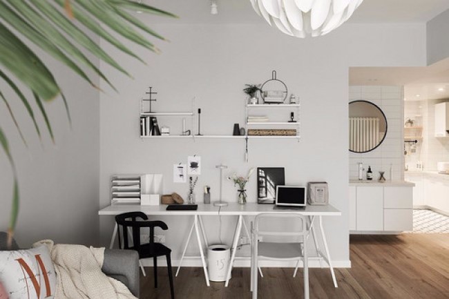 家庭工作区全景,也可以看到它和浴室柜、厨房的关系,形成一种互动,让生活更为开放;而白色的基调格外干净,墙面的收纳架与书桌成就空间的收纳美学。