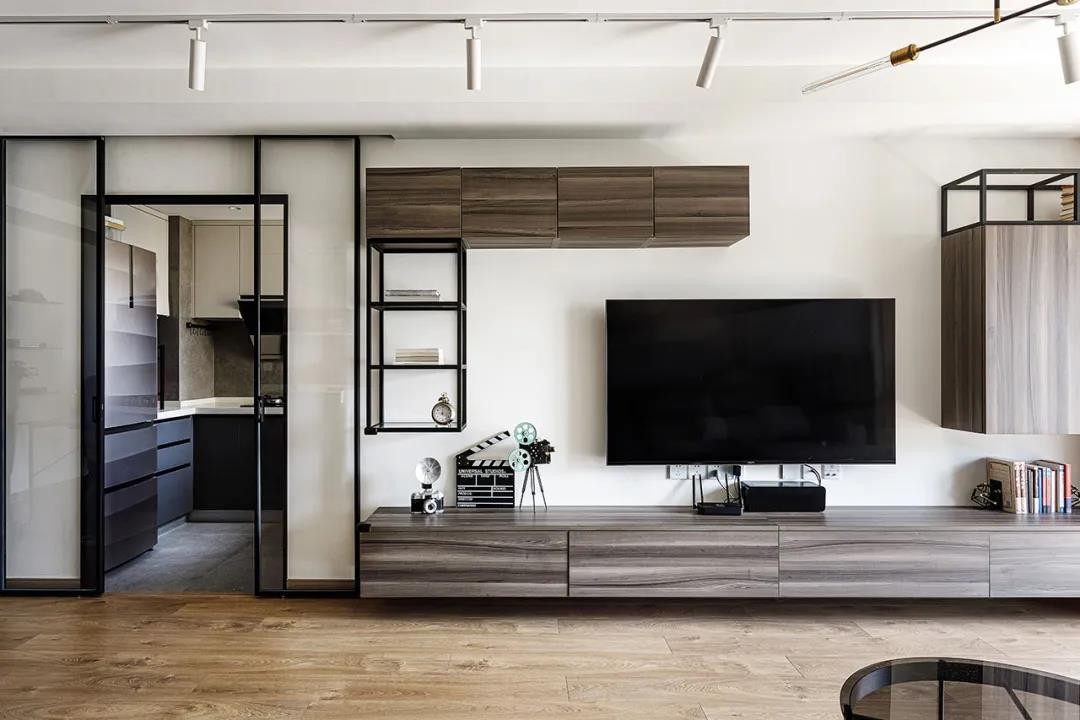 暖灰色木纹柜体与铁艺置物架结合的电视柜,在高低错落之中,隐隐散发出建筑的美感。