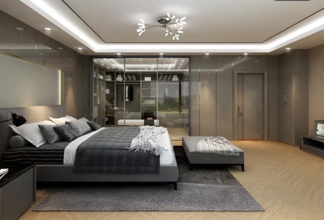 主卧灰色系床铺和地毯,显得更加舒适时尚自然,衣帽间采用通透的玻璃隔断,增加了空间的深度和广度。