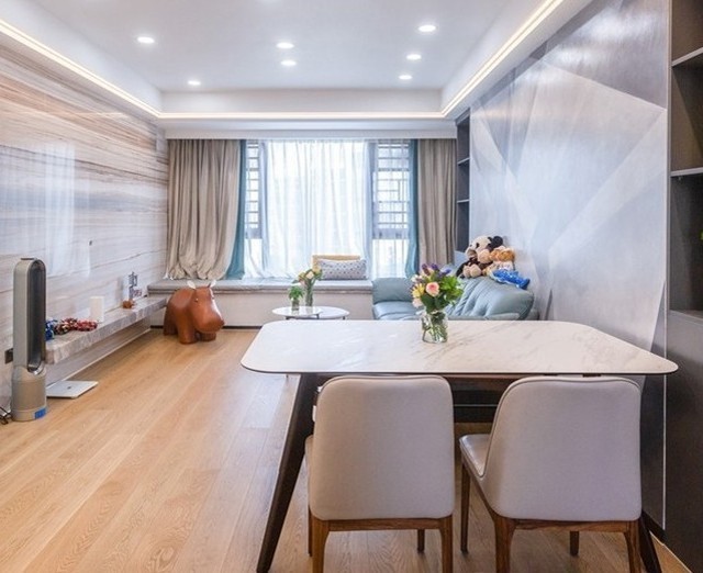 本案业家中能更加明亮通透,希望有一个舒适的环境,设计师结合业主的需求,打通客厅阳台、开放厨房和生活阳台,使客厅餐厅厨房成为连通的流畅整体,充满了明朗与舒适感