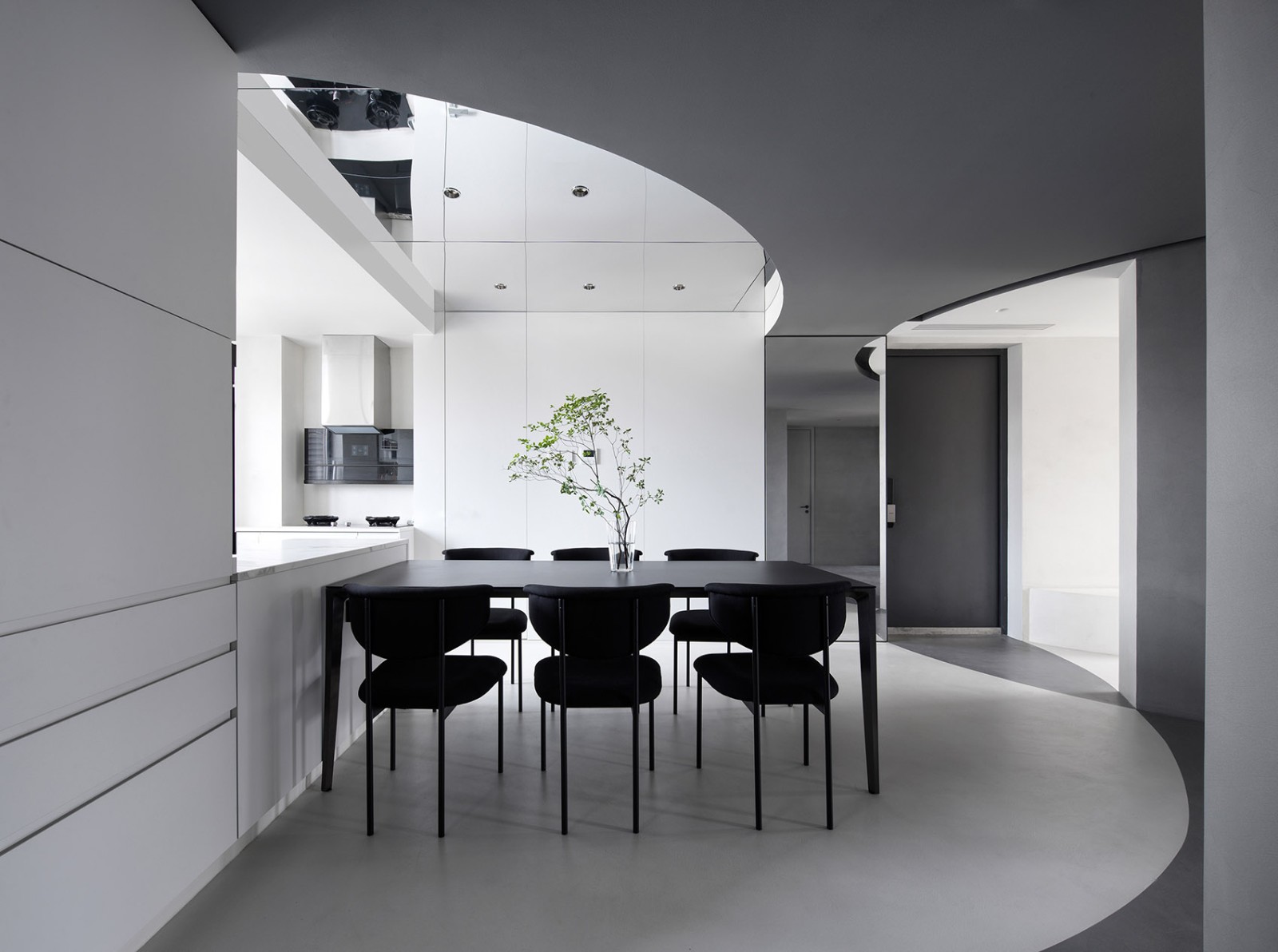 白色地面对应弧形吊顶形成开放式餐厨区域,浅色系运用呈现明亮跳跃的空间氛围。岛台加强厨房与餐区互动的流畅度,操作台面增加,烹饪与用餐场景融为一体。选用深灰色的餐桌座椅与周边灰色区域形成呼应,岛台式设计解决一家六口用餐需求。顶部与墙体的镜面材质拉伸视觉空间,弧线得以闭合。