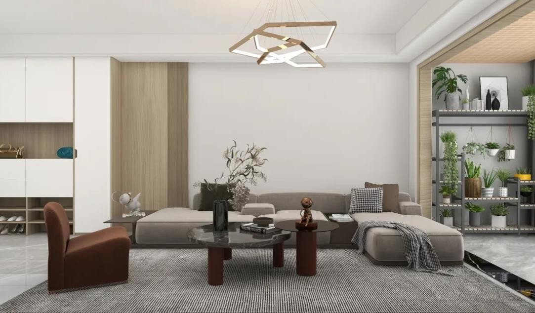 客厅设计极简,采用局部木饰面点缀。