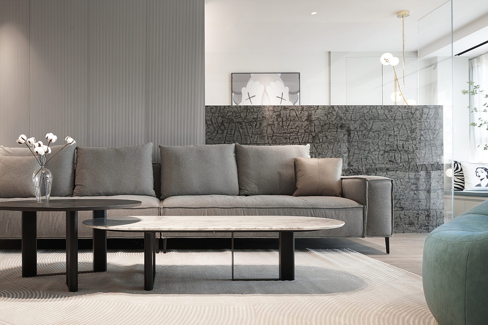 简洁的基底上,设计通过线条、材质的碰撞实现空间的丰富。沙发背景粗犷纹路的大理石与质朴木饰面的碰撞,丰富了空间的肌理。地毯纹路与茶几形状的呼应,以及客厅对侧大理石体块的分割、重组,在光影的配合下,空间的层次更为丰满而立体。一只彩***装置的加入,给予了空间生动的表情,也为日常生活增添了一抹不失风雅的趣味。藉由大株绿植将自然引进室内,并通过大敞的落地窗,尺度地保留观景界面,使得室内环境与室外景