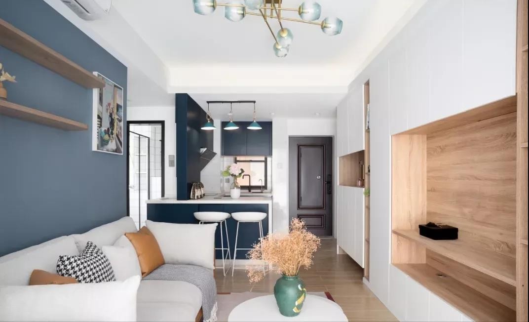 全屋整体以纯净的蓝白色打底,辅以质朴原木色与白色收纳柜,开放式厨房与客厅相连,打造更多的互动和收纳空间。