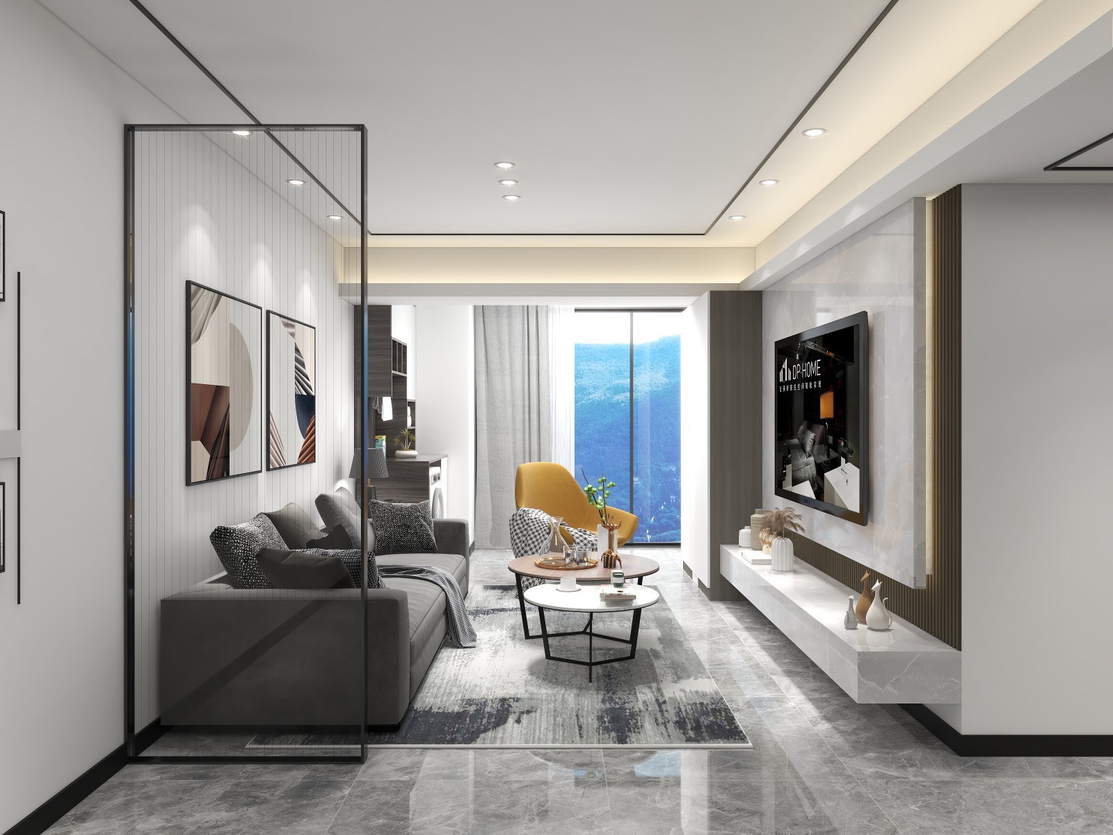整个客厅空间遵从了现代主义中“少就是多”的装饰原则,简洁大气,沙发背景墙和电视背景墙均是无造型线条的简约设计,大面积的落地窗,使整个空间通透明亮,搭配简洁的家居,给人一种轻快舒适的感觉。