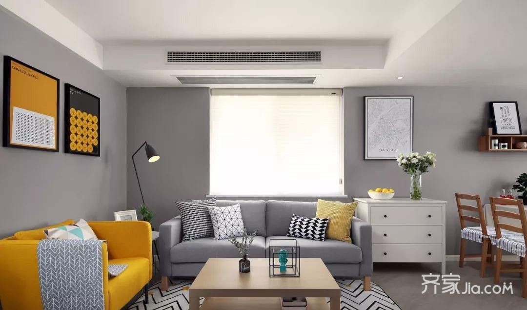 客厅整体灰色墙布和水泥色地砖让整体显的干净明亮,波浪线地毯让空间律动起来