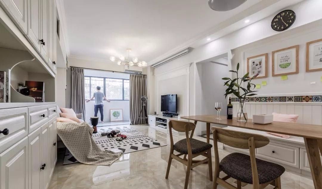 沙发墙旁边设计了大面积的收纳柜,为客餐厅提供了充足的收纳储物空间。