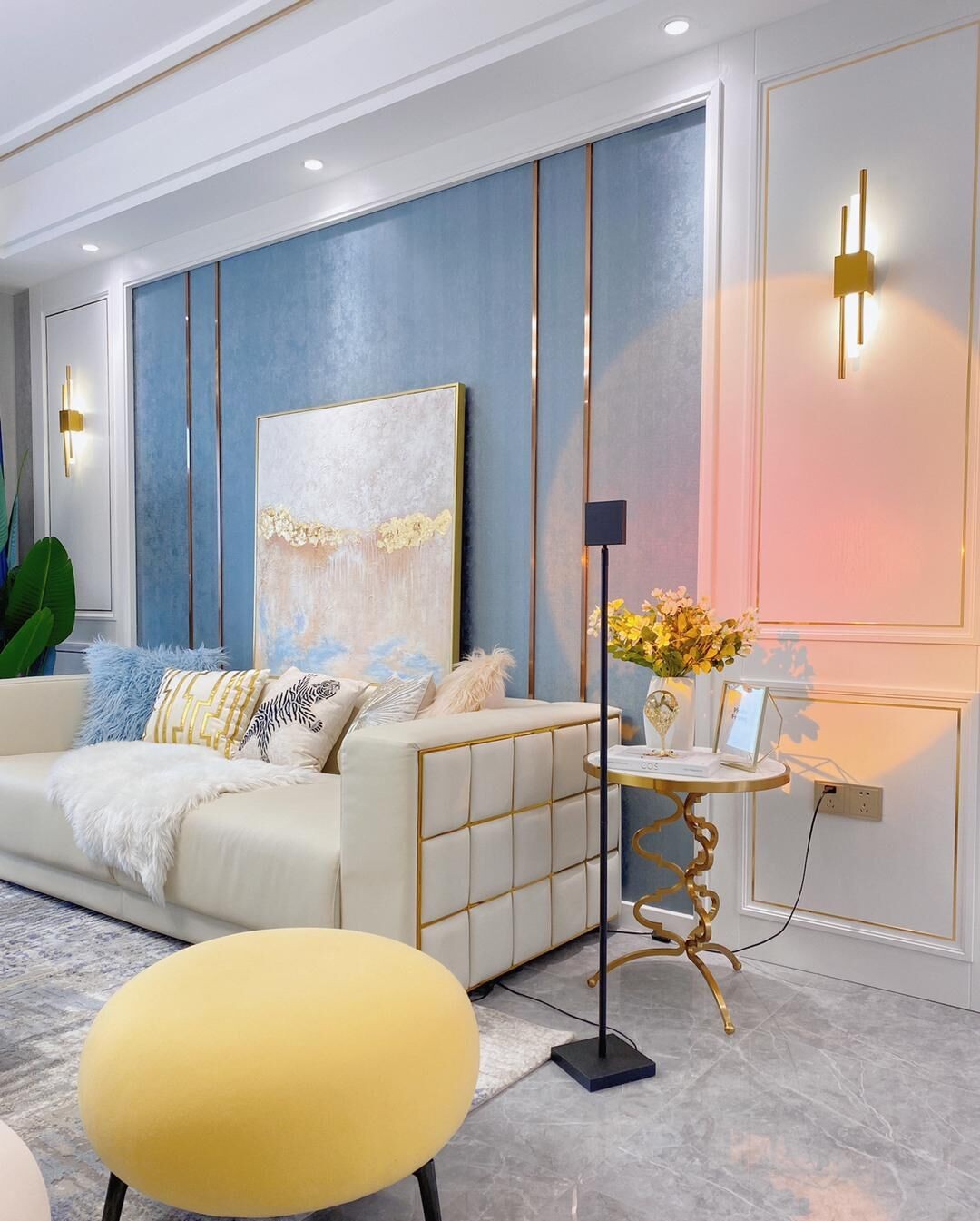充满设计感的吊灯下面是蛋糖奶白色的一字型沙发,紧靠着后面蓝灰色的背景墙