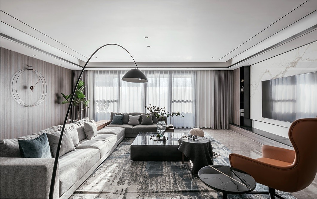 电视背景墙,大板砖落地电视柜、钢板,保留现代感的灵活分割。