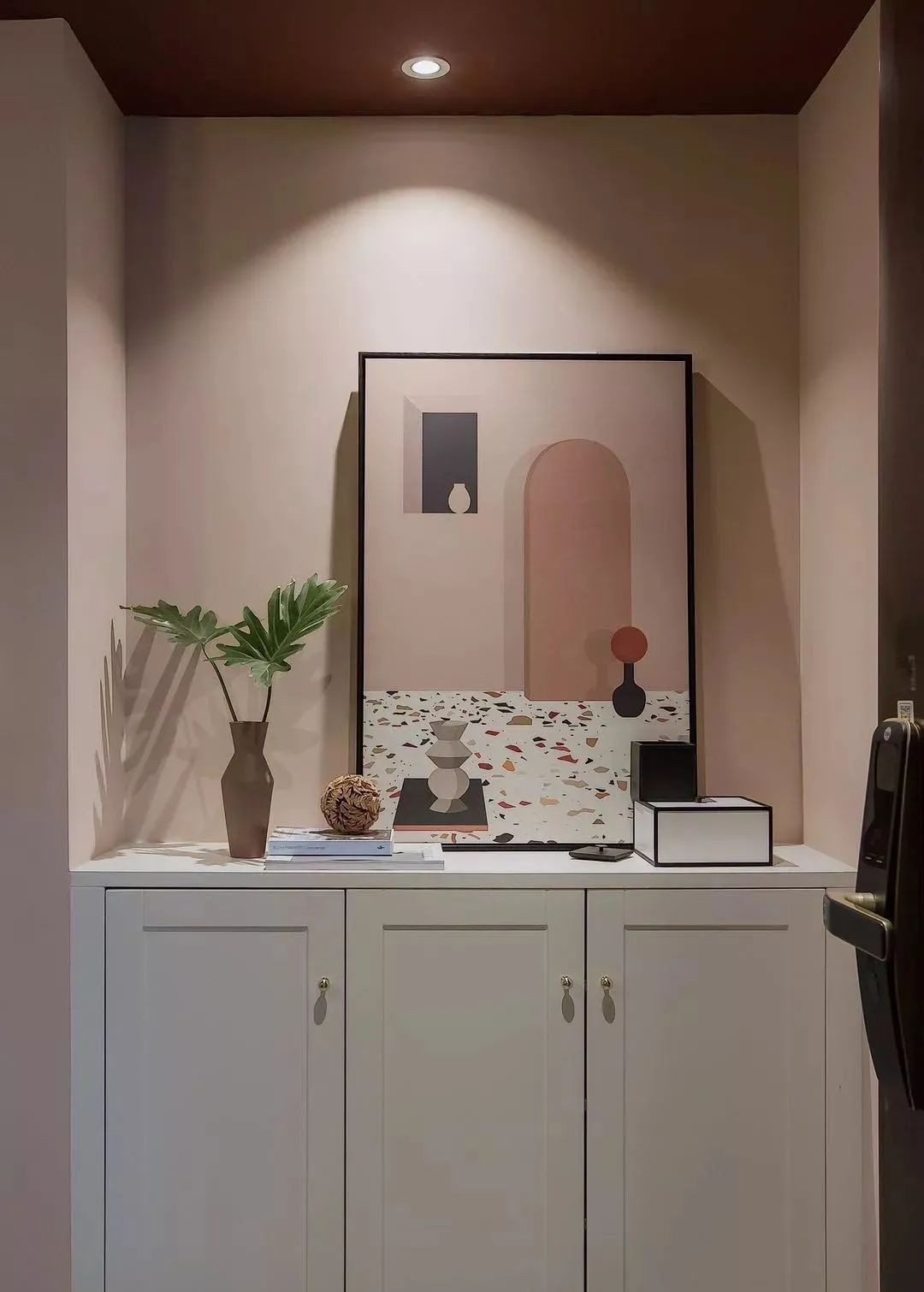入户右侧是玄关柜,满足收纳的同时也很注重美感的营造。进门左边摆了一个换鞋凳,红色与高处的背景色调相呼应,很有御姐范儿。