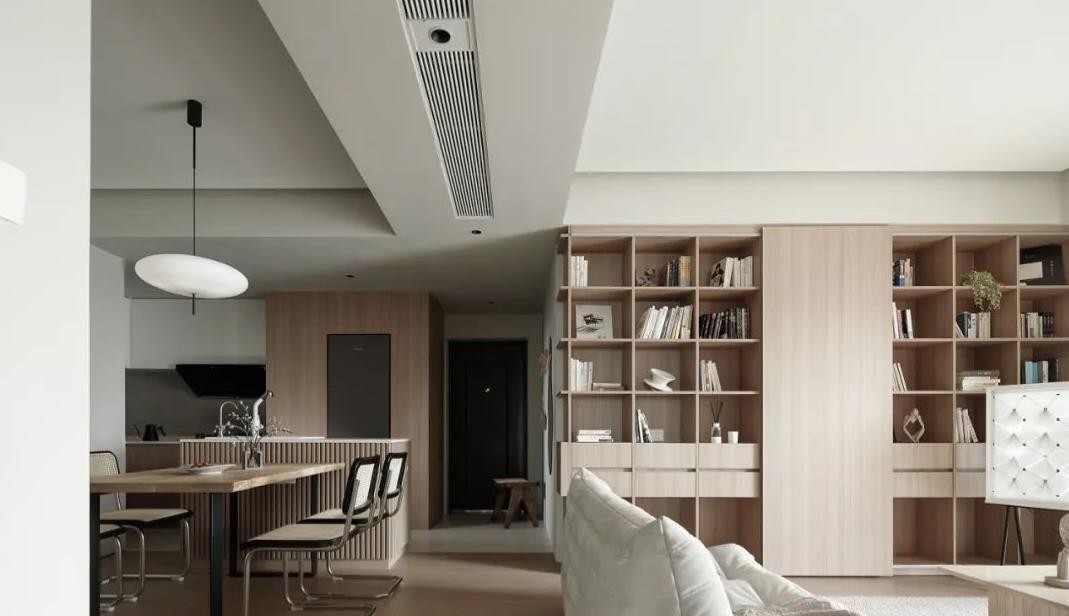 客厅的左边的墙面凿空,打造了一面开放格书柜,既有收纳又有展示的空间