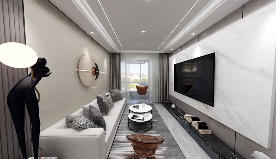 护墙板搭配岩板连纹大理石背景墙,无主灯线性灯