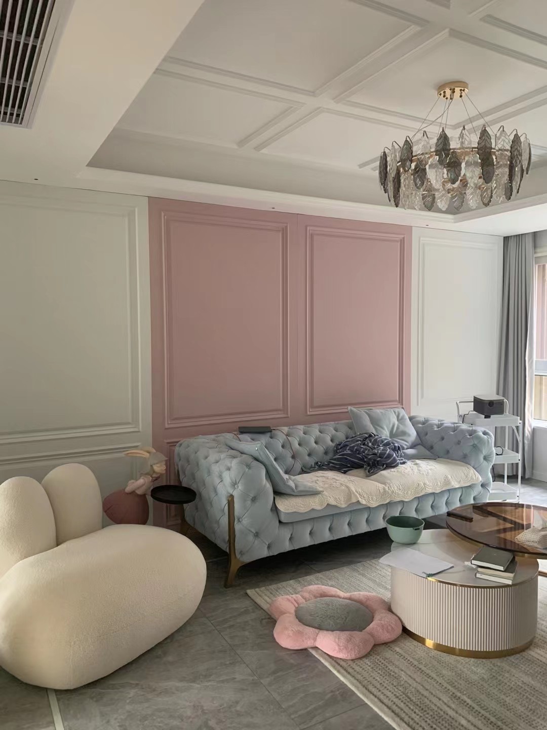 护墙板上墙,采用白色与粉色的撞色,与整个空间颜色更协调