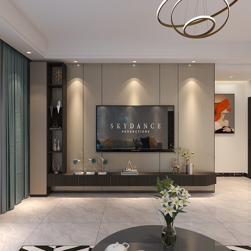 电视背景墙采用的是木饰面板搭配,简单而耐看。