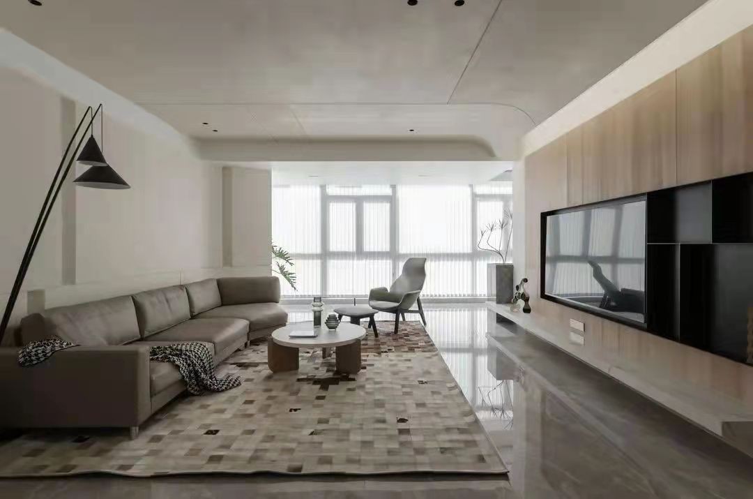 客厅采用无主灯设计,电视背景墙用原木色面板,更显清新干净。