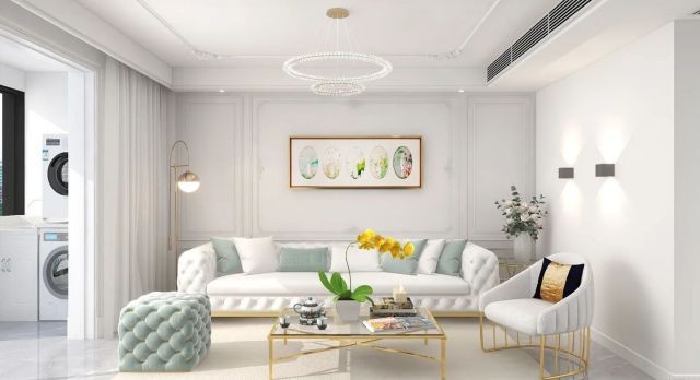 吊顶线条和沙发背景线条统一,整体空间以浅色系为主,绿色作为点缀色,让空间显得不单调