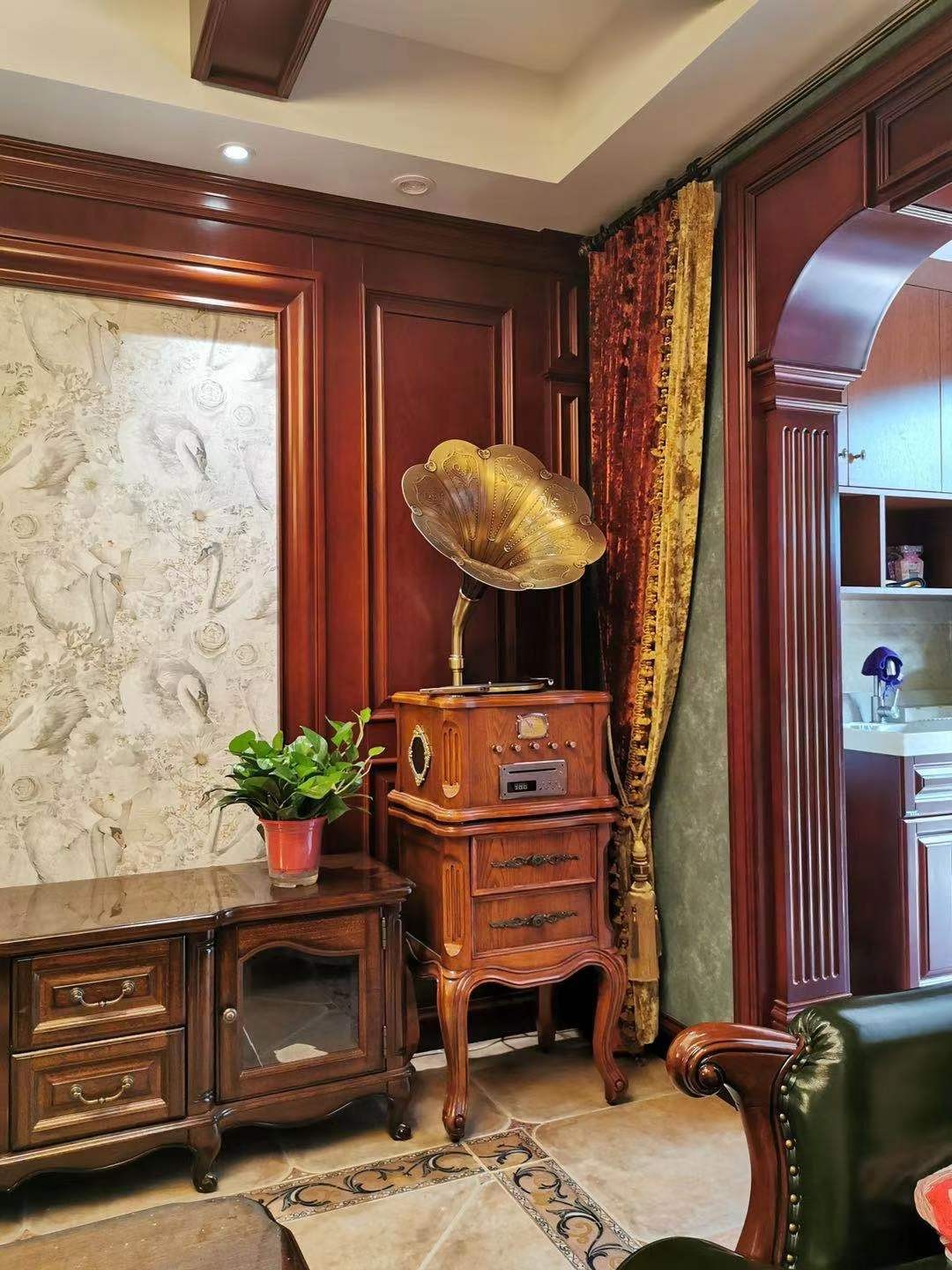 美式风格在装饰上也有很多讲究,喜好仿古面的墙砖、喜好使用实木制作橱柜门板。 所以设计师特地使用了美国橡木为其定制橱柜和门扇,使美式风格更为凸显。