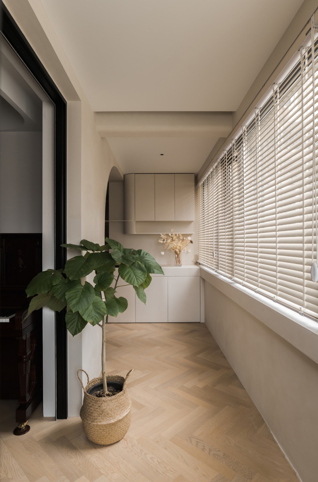 人字拼地板通铺过去,界限感在门洞上体现,“D”字形门洞更具有设计感,弧形的曲面设计柔化了空间气质,让两个空间连而不断,各自独立又共为整体。