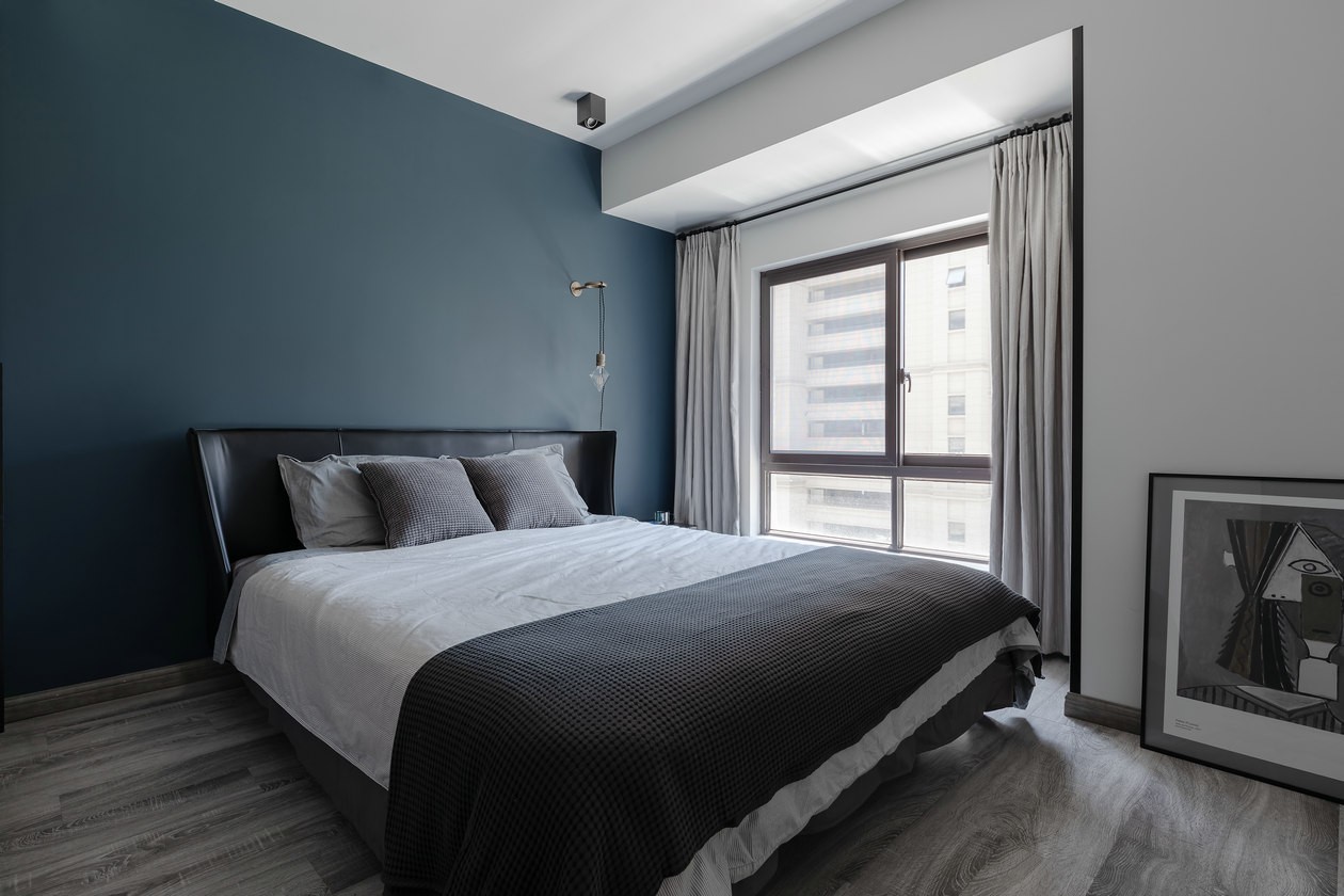卧室灰蓝色背景,浅灰色地板