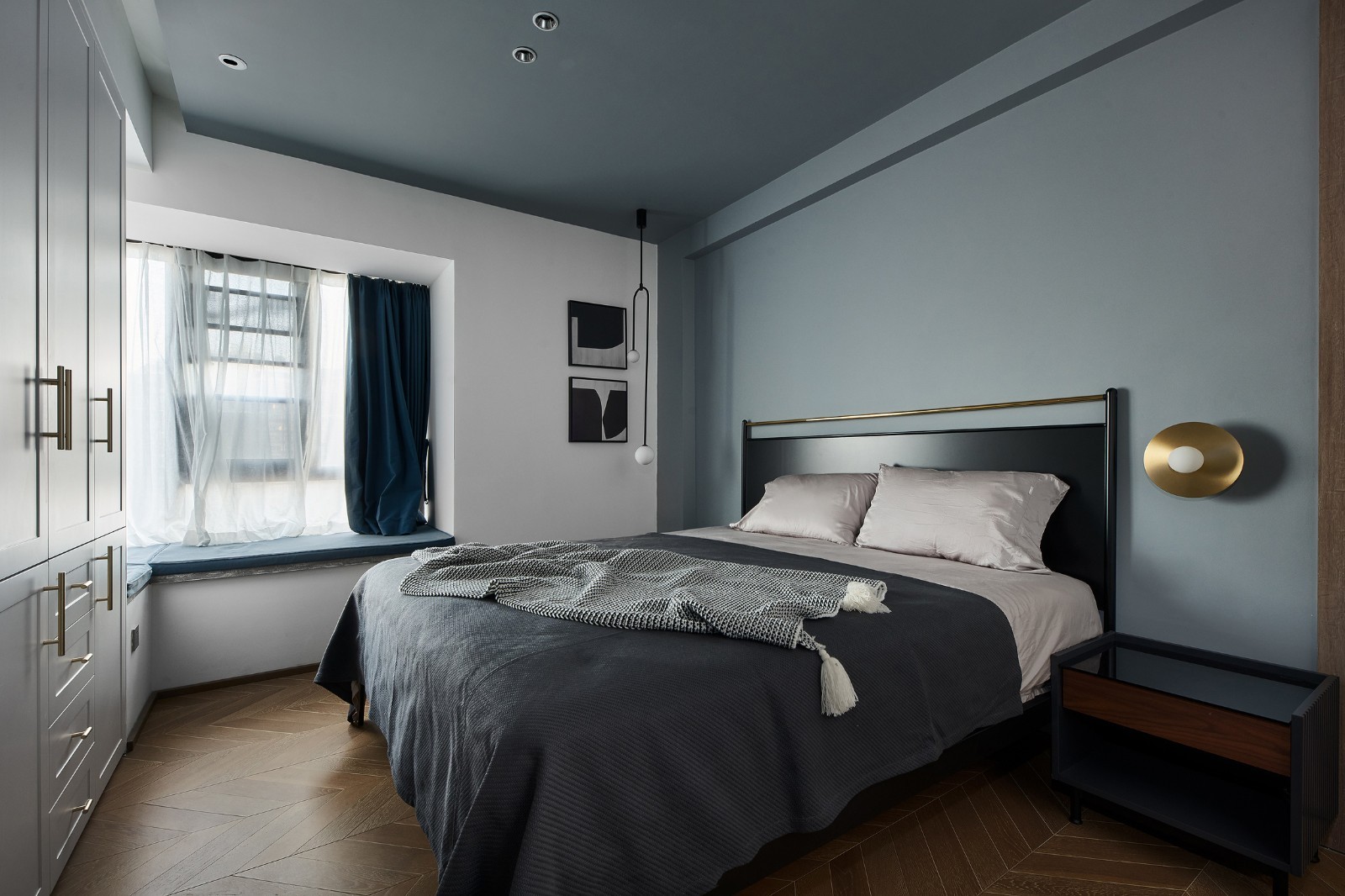 主卧把衣柜设计到了床的正前方,空间有限所以就把顶和床头背景墙用一个乳胶漆颜色串联起来,让空间更大气